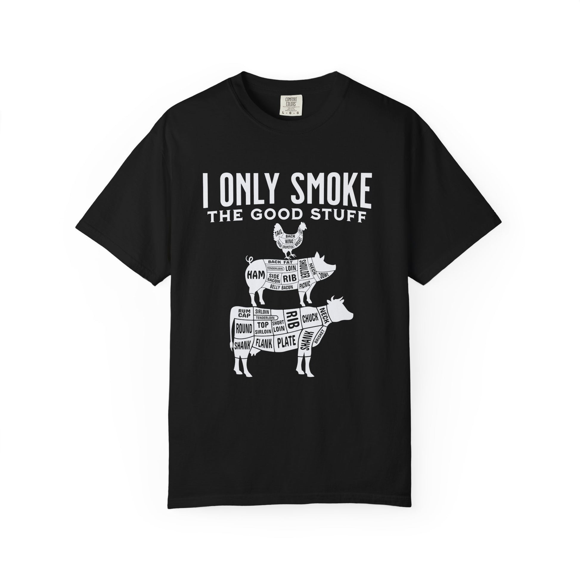 Introducing our "I Only Smoke the Good Stuff" men's t-shirt – a sizzling blend of humor and culinary passion. This shirt features a playful design with a cow, pig, and chicken, each showcasing labeled meat cuts, making it a visual delight for barbecue enthusiasts. Crafted for those who appreciate premium flavors, this shirt is a declaration of your commitment to quality grilling. Whether you're a pitmaster or simply love exceptional barbecue, embrace style and humor with this unique shirt that combines good taste with a touch of whimsy.
