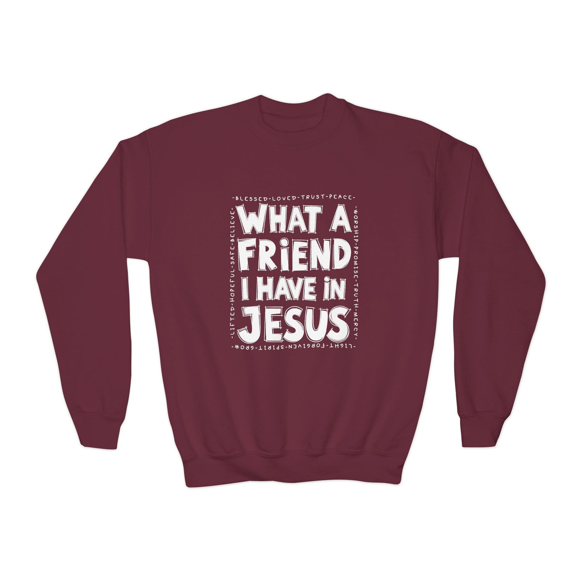 Inspire your little one with powerful truth they can wear! This Youth “What a Friend I Have in Jesus” Crewneck Sweatshirt features a bold, faith-filled design surrounded by encouraging words like blessed, loved, trusted, peaceful, hopeful, and forgiven. It’s the perfect Christian sweatshirt for kids who want to share their love for Jesus with confidence and style.