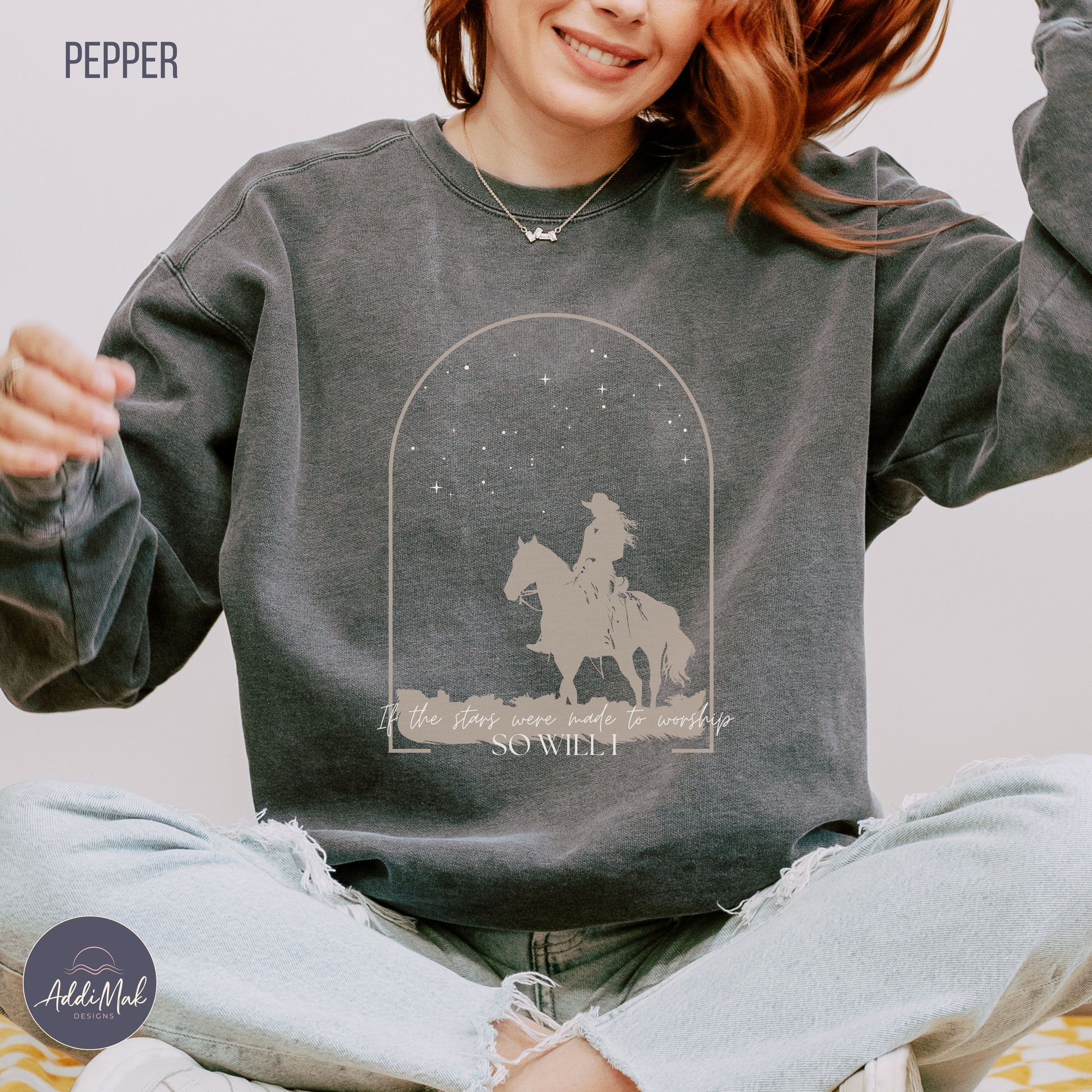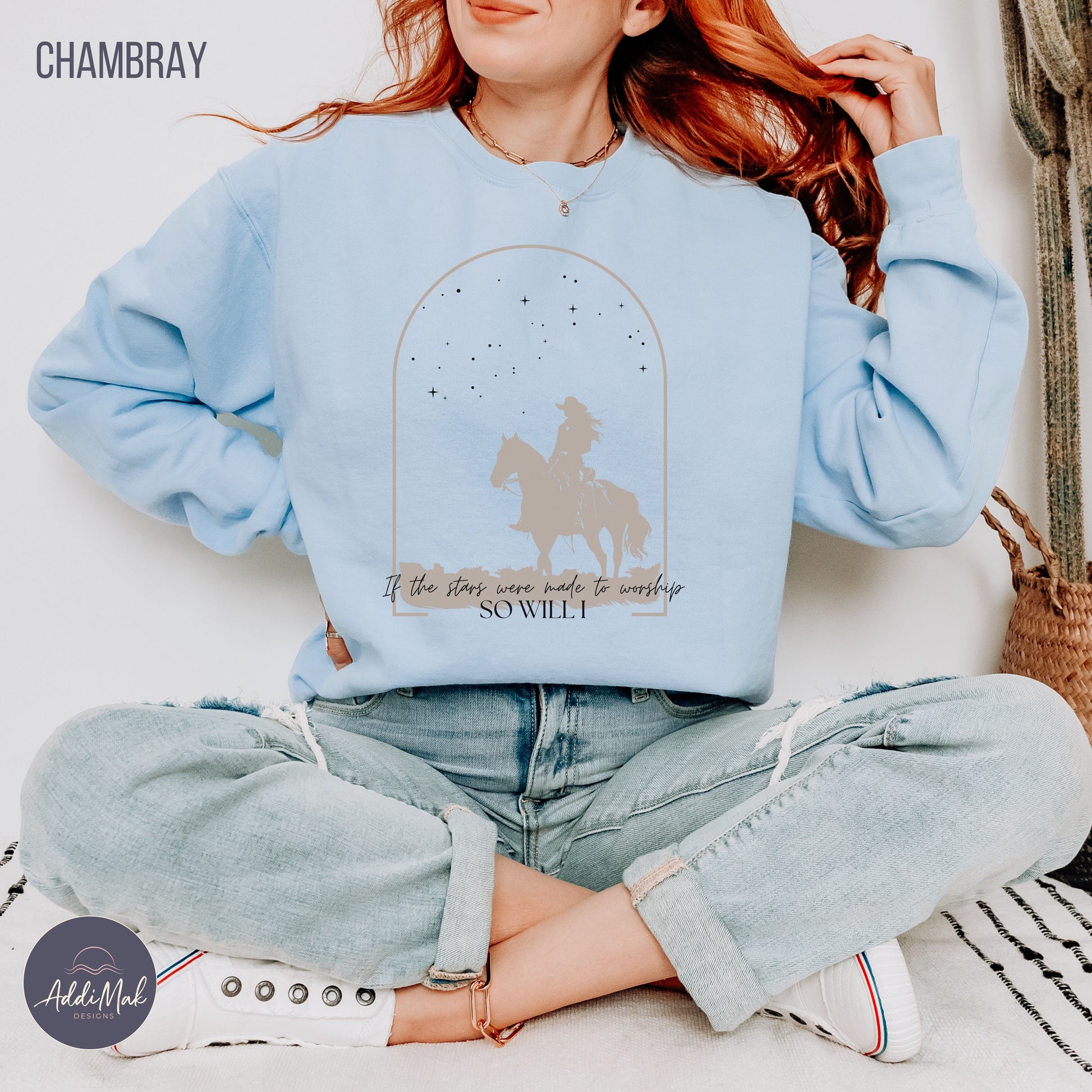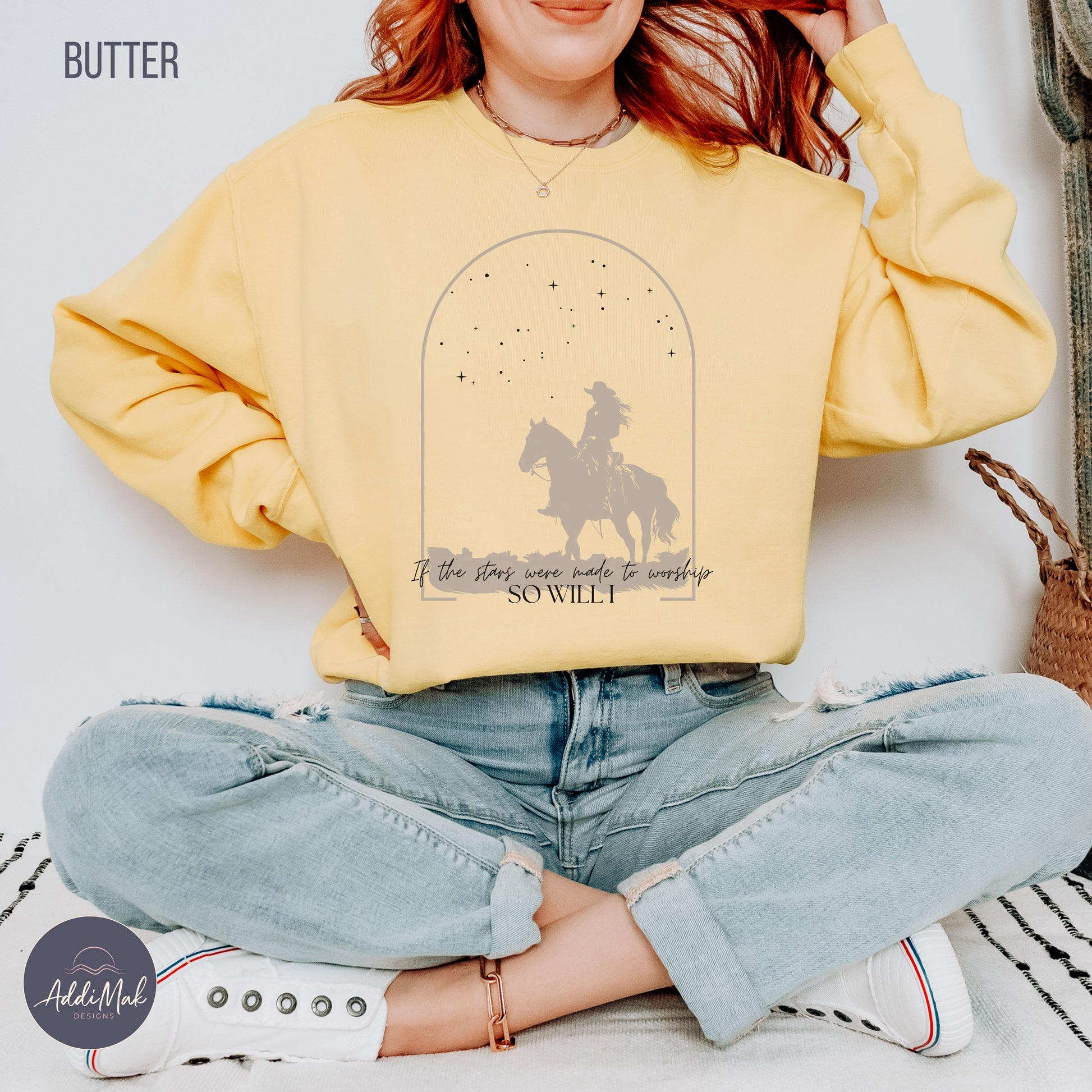Embrace faith and western charm with our cozy crewneck sweatshirt featuring the inspiring phrase, ‘If the stars were made to worship, so will I.’ This unique design showcases a graceful cowgirl on horseback beneath a celestial backdrop of stars, framed beautifully within an arch. The combination of faith, nature, and rustic style makes it a meaningful addition to your wardrobe. Pair it with jeans or boots for a look that’s as timeless as your faith.